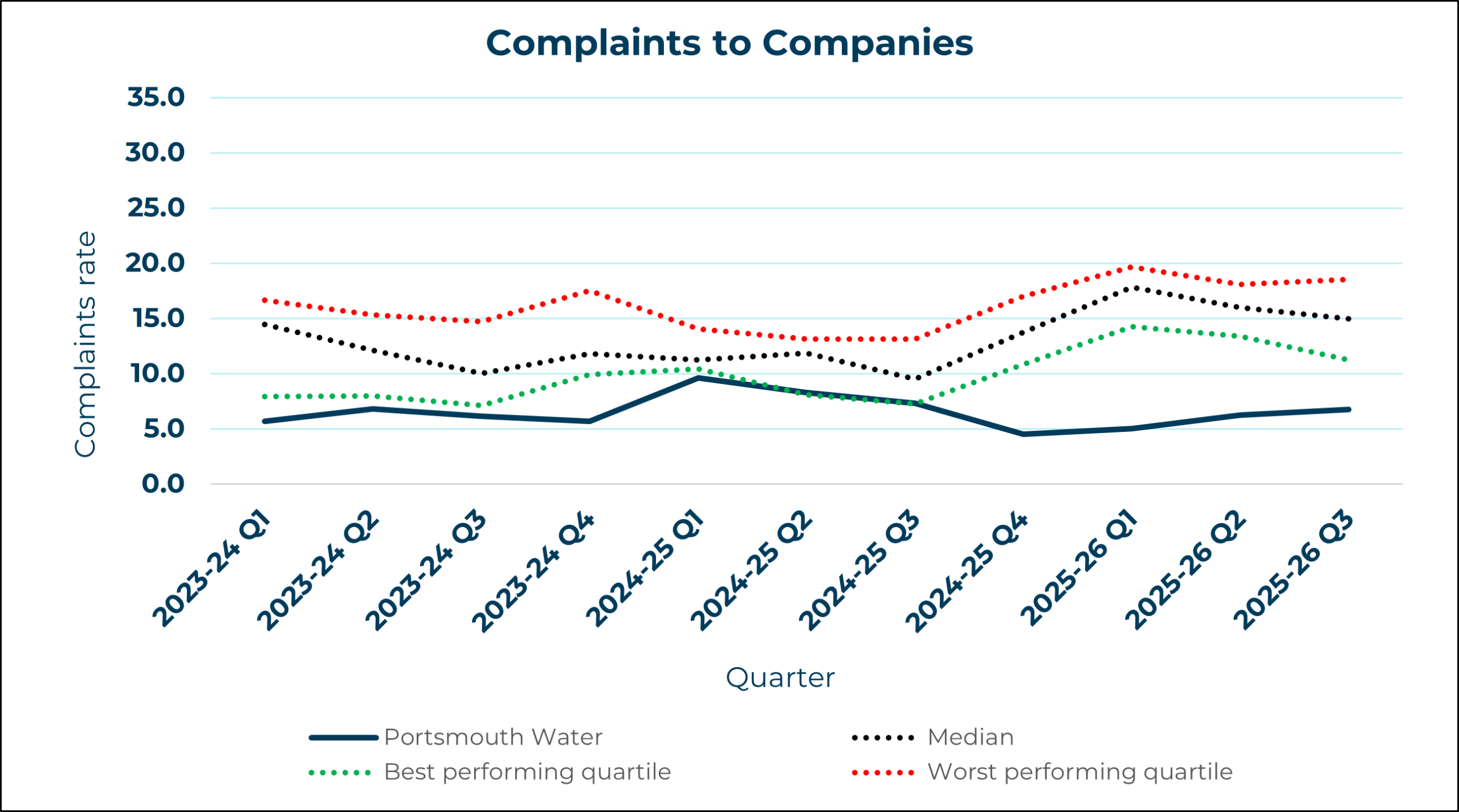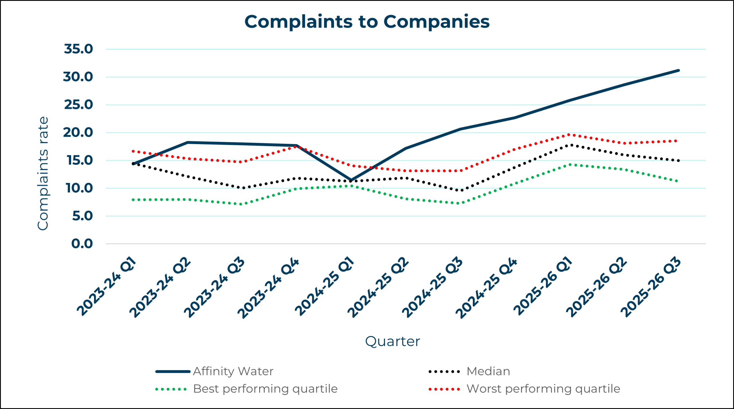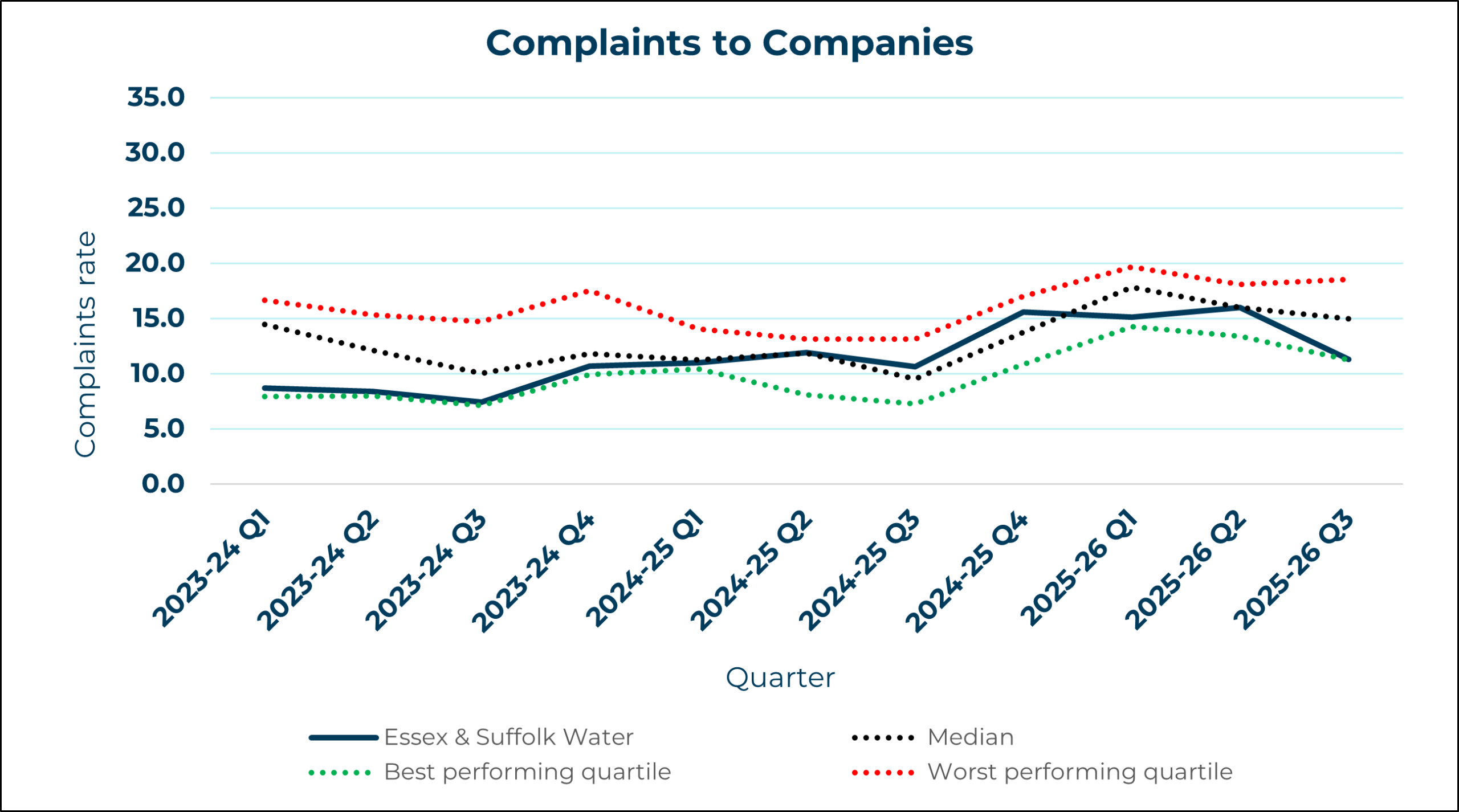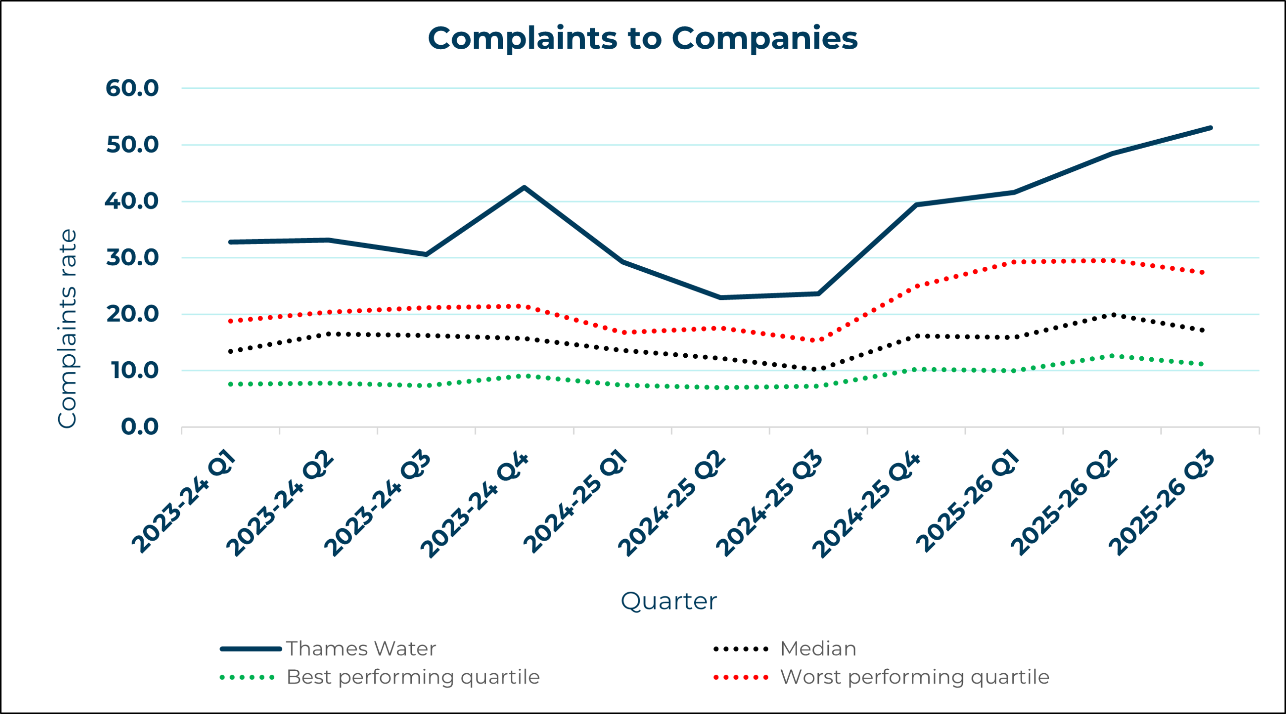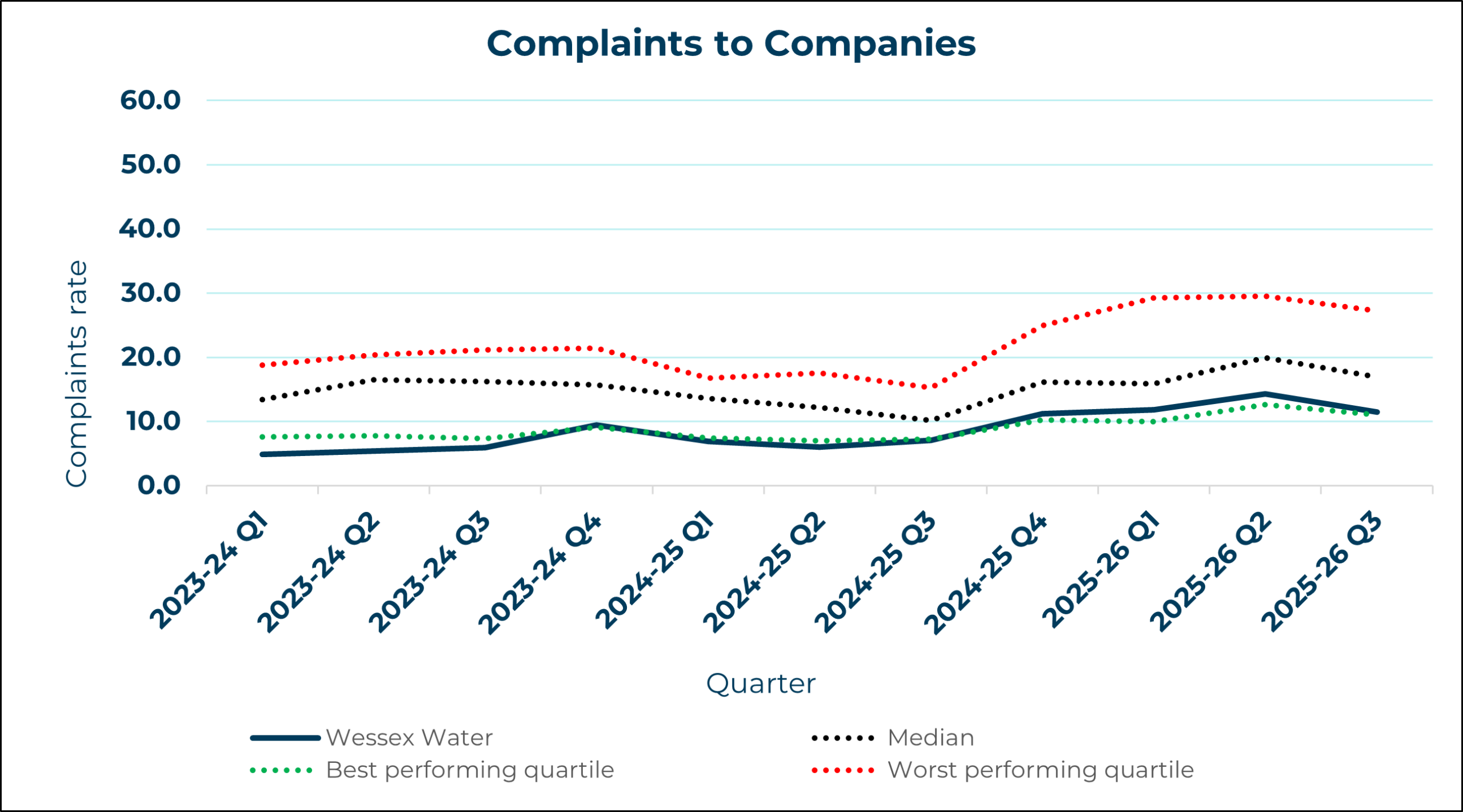 To compare companies of different sizes, we use a metric called ‘complaints per 10,000 connections’. This metric takes into account the number of water and wastewater connections each company serves.