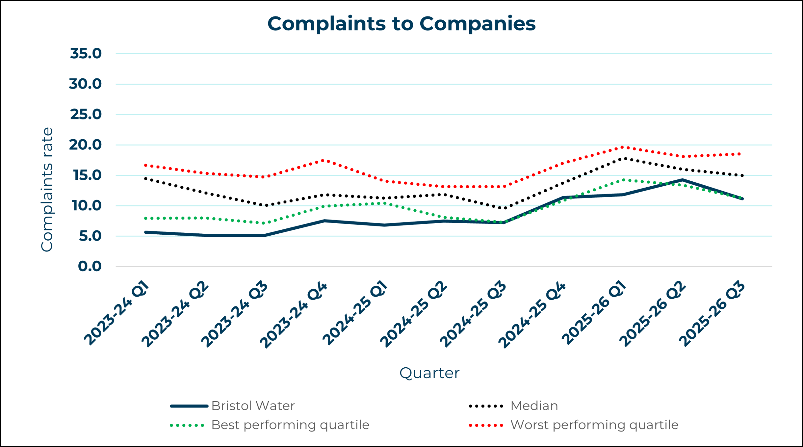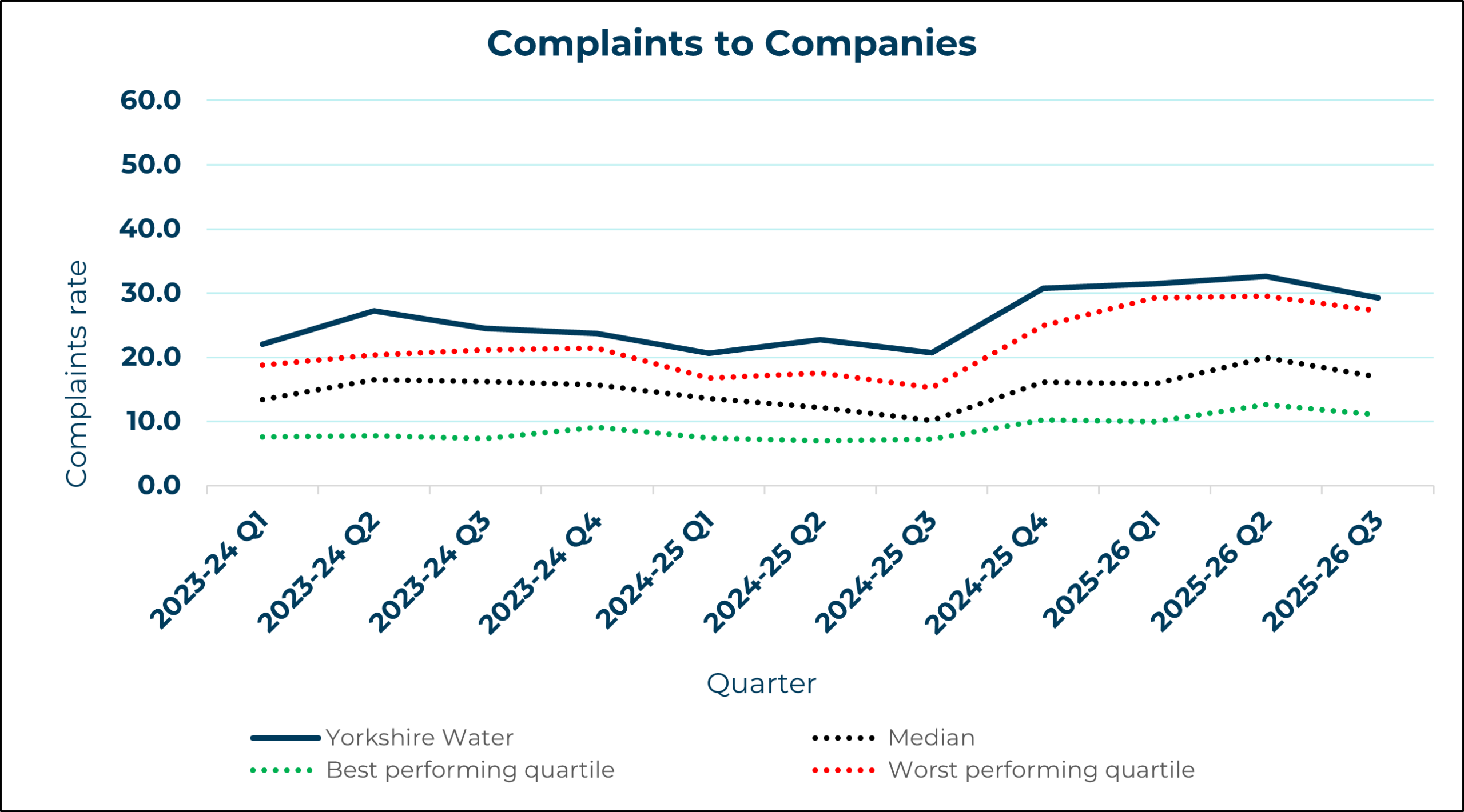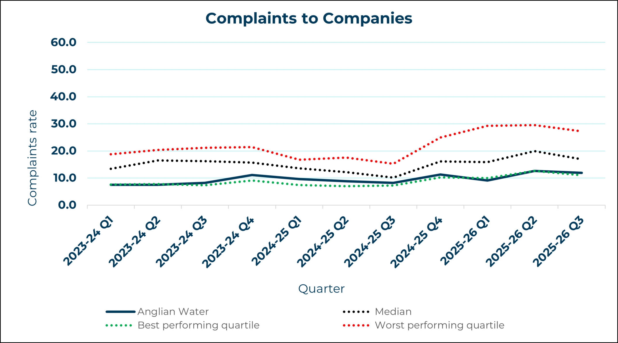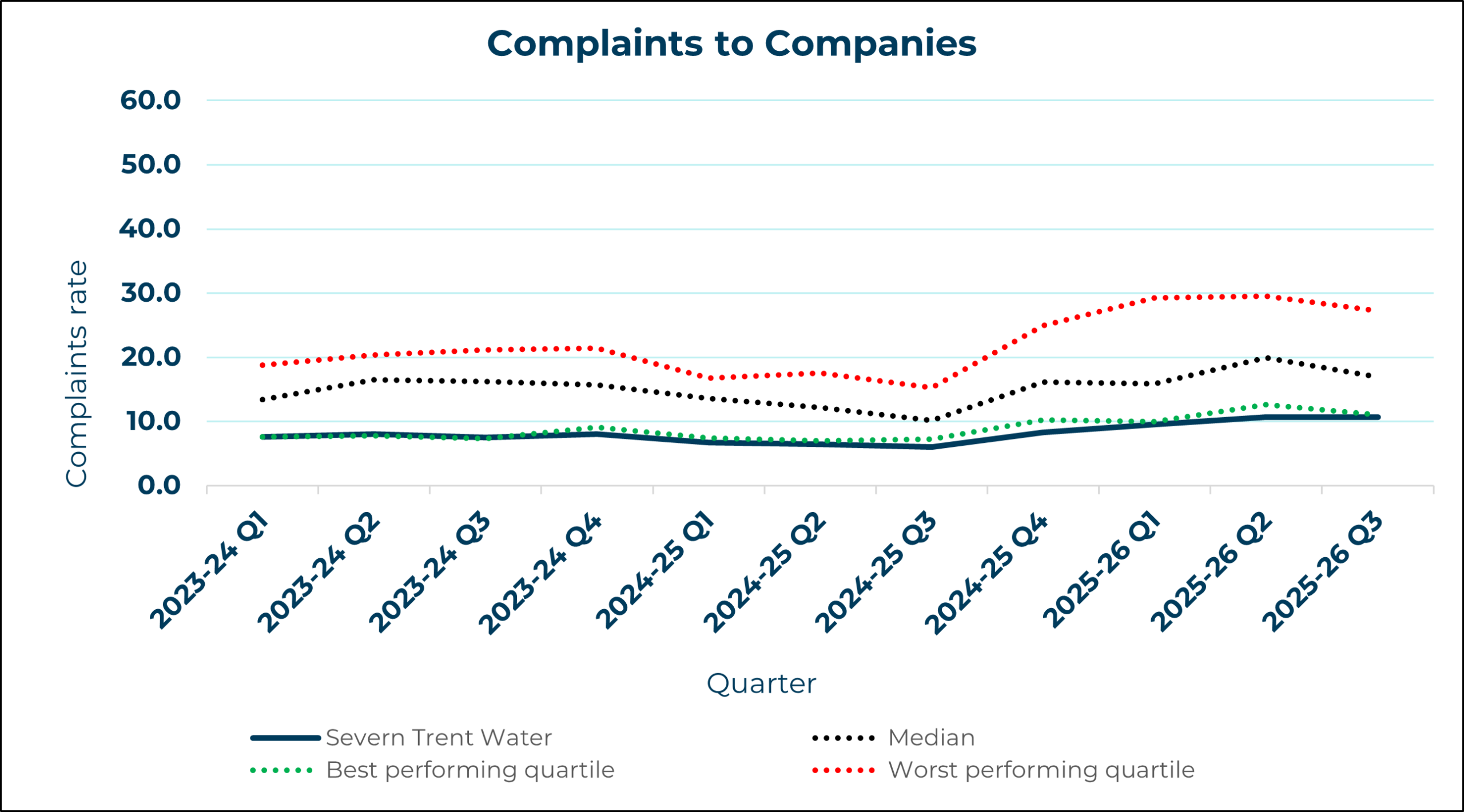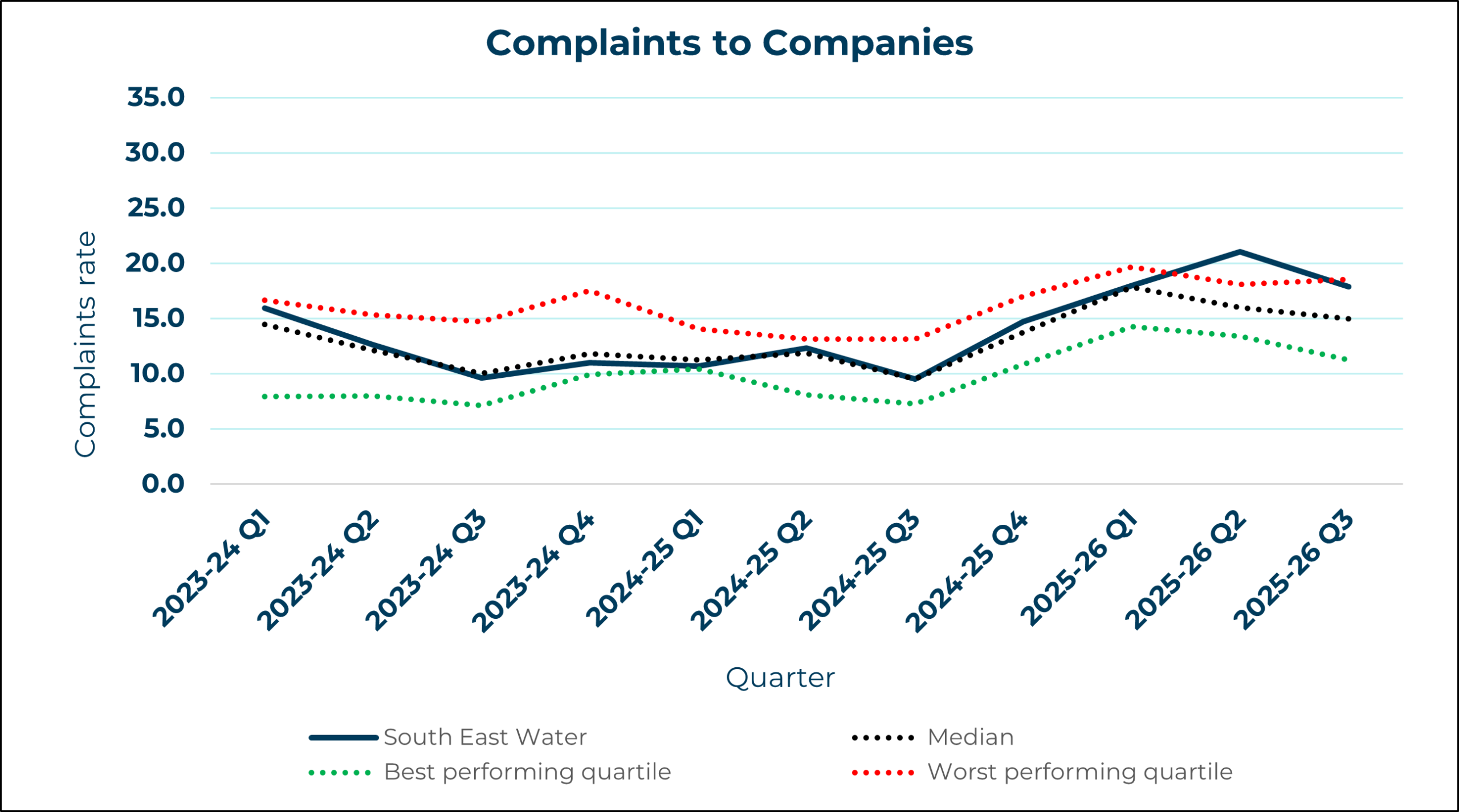 To compare companies of different sizes, we use a metric called ‘complaints per 10,000 connections’. This metric takes into account the number of water and wastewater connections each company serves.
