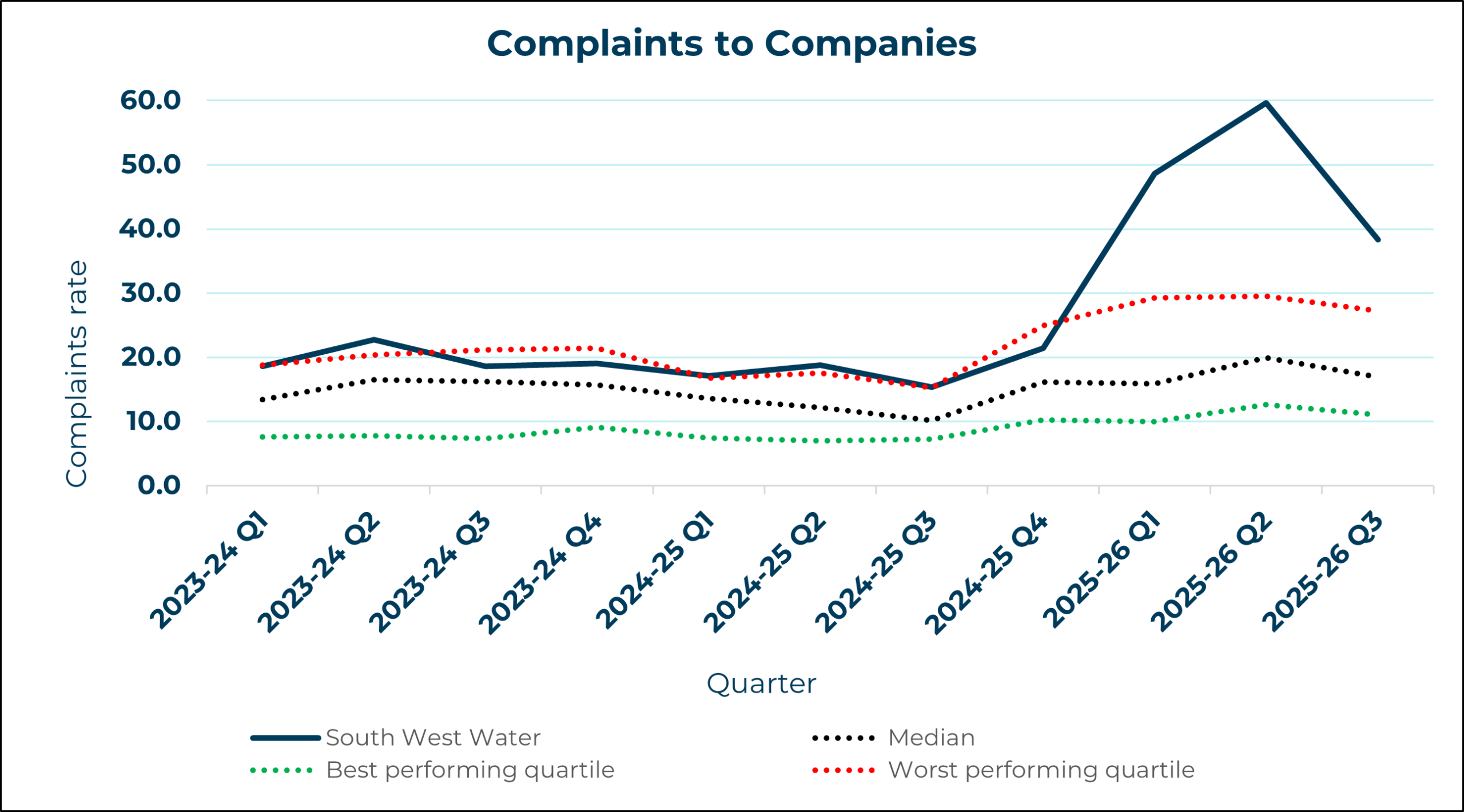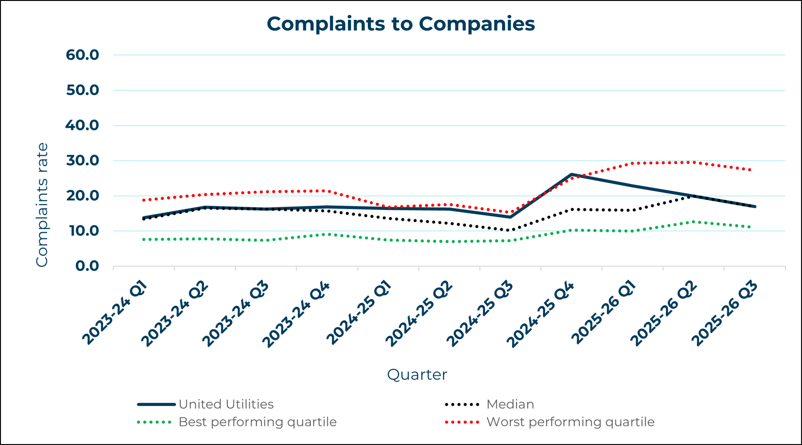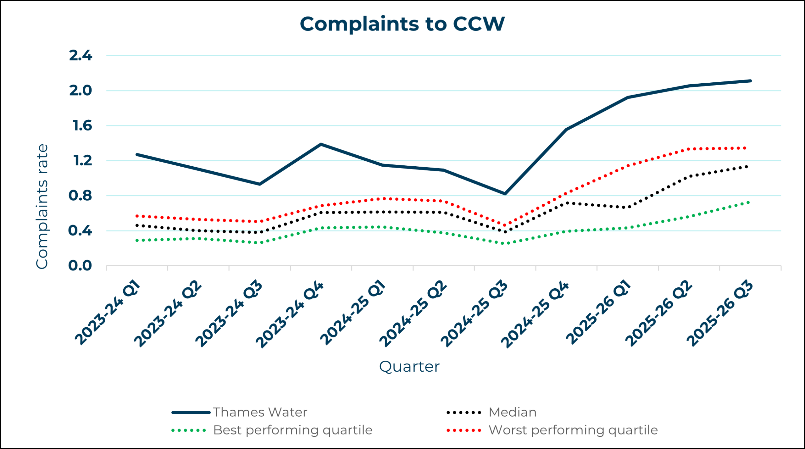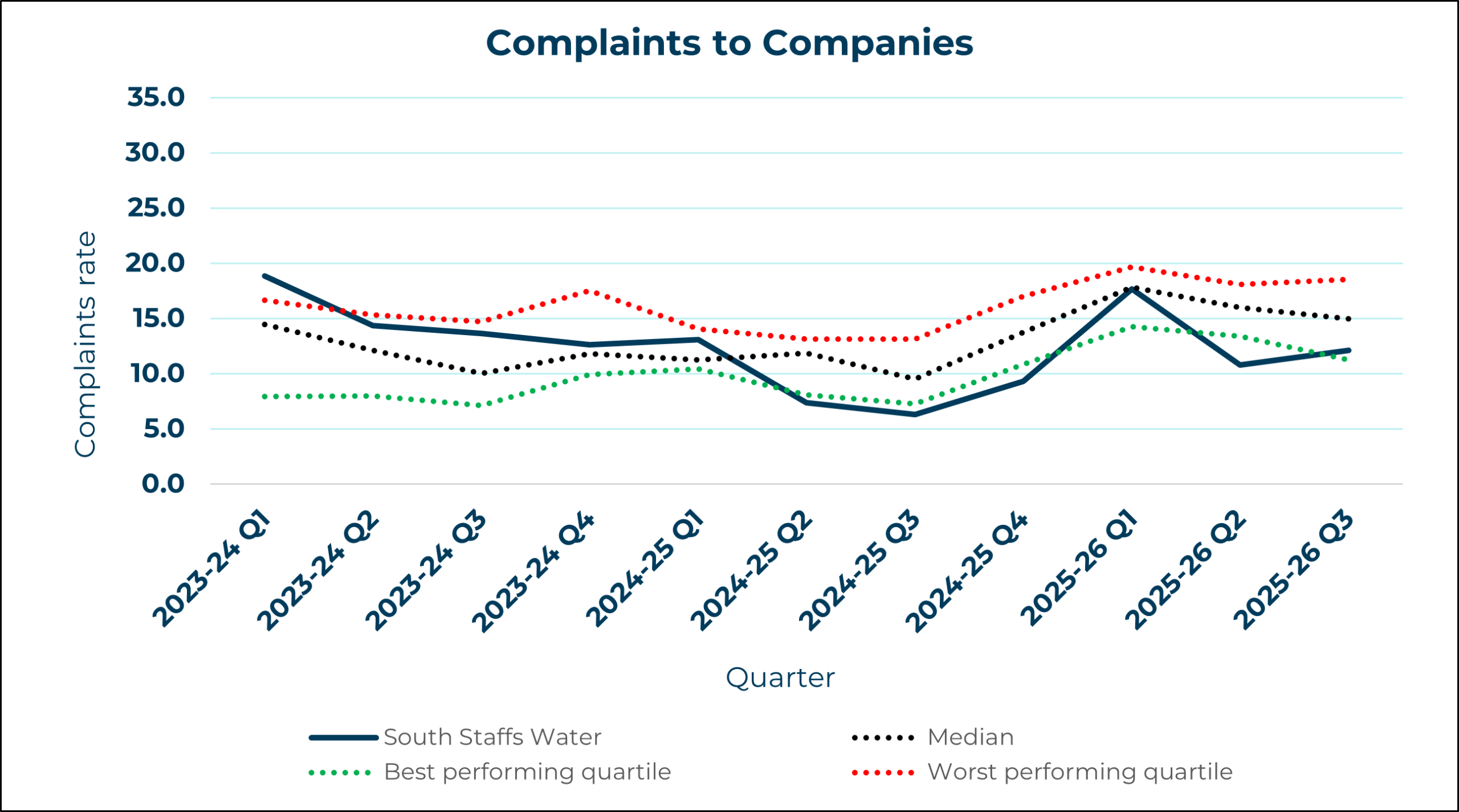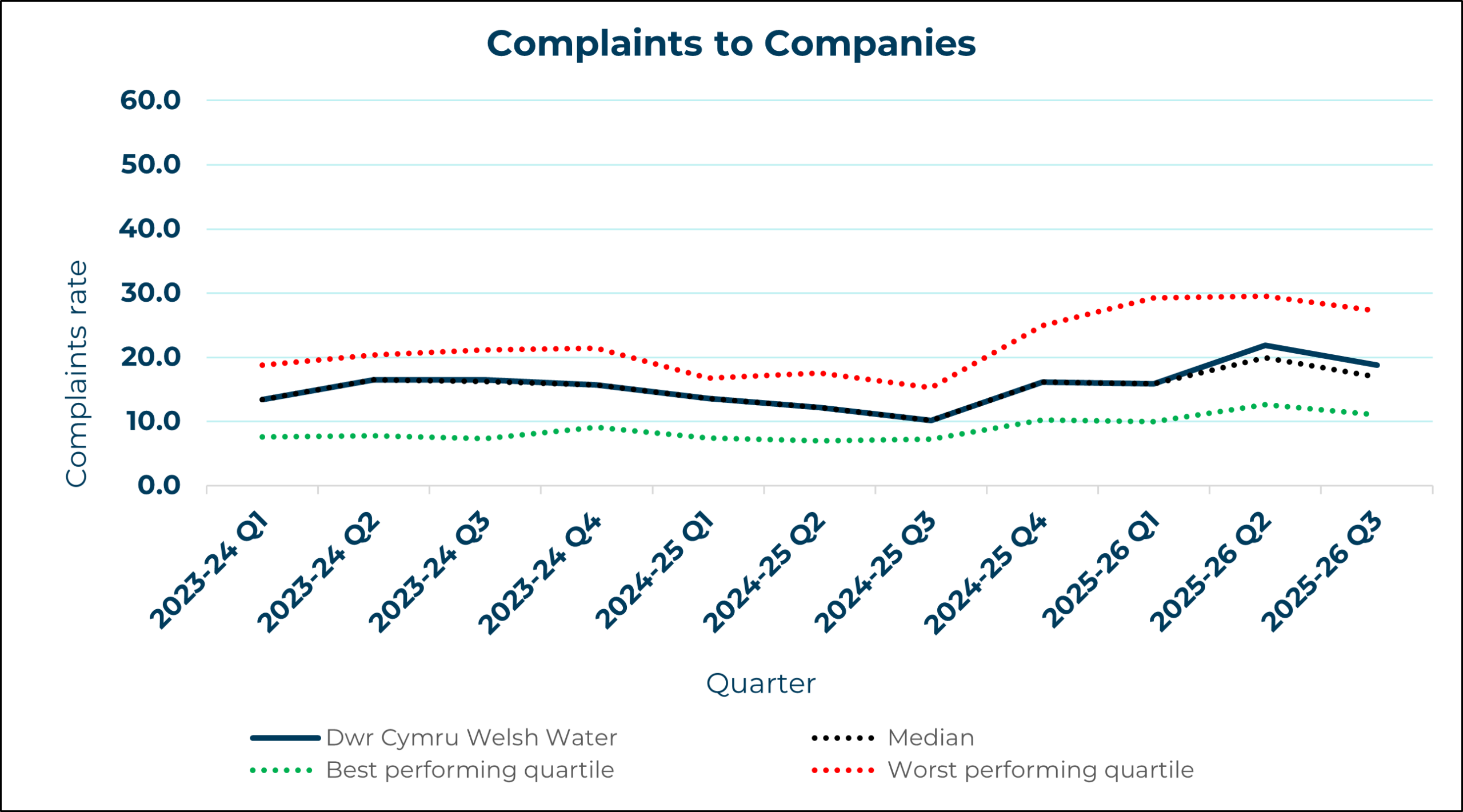 To compare companies of different sizes, we use a metric called ‘complaints per 10,000 connections’. This metric takes into account the number of water and wastewater connections each company serves.