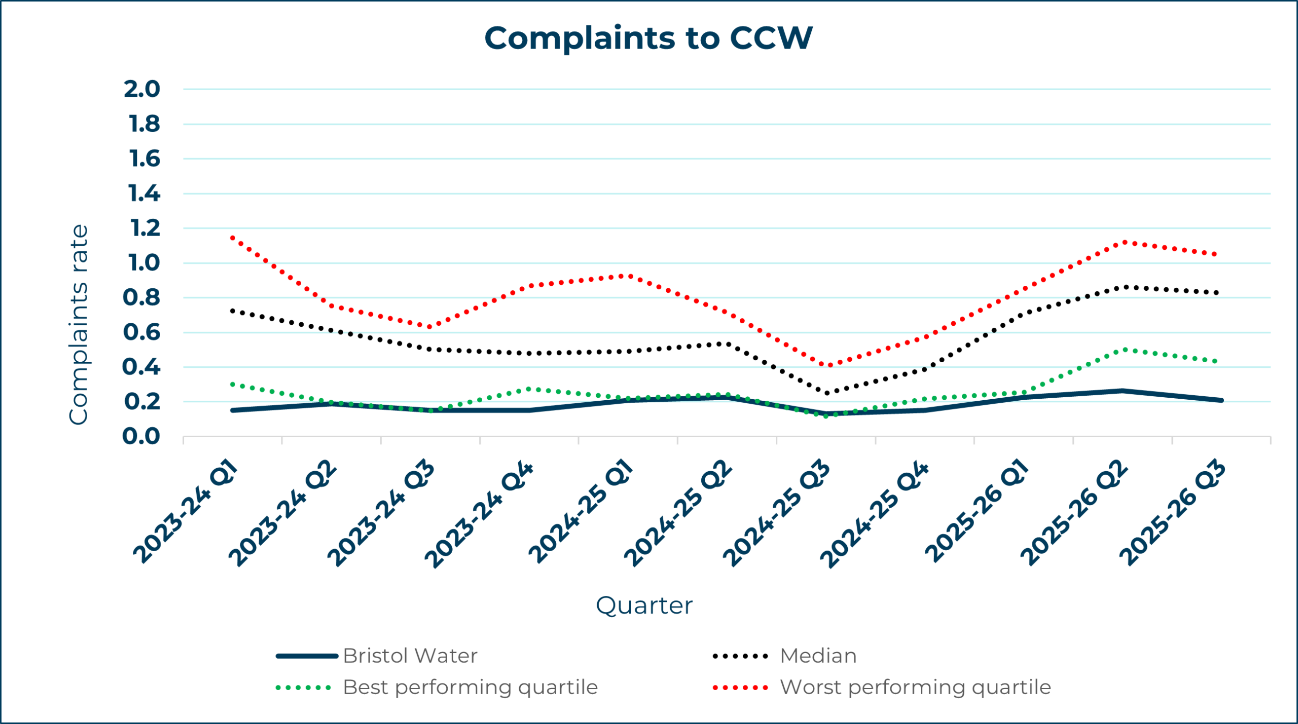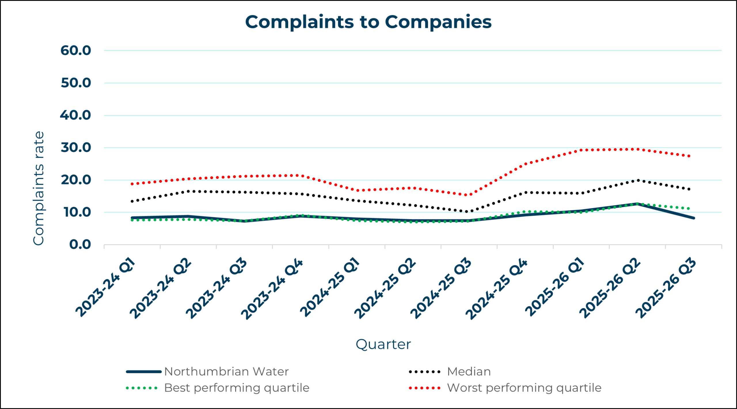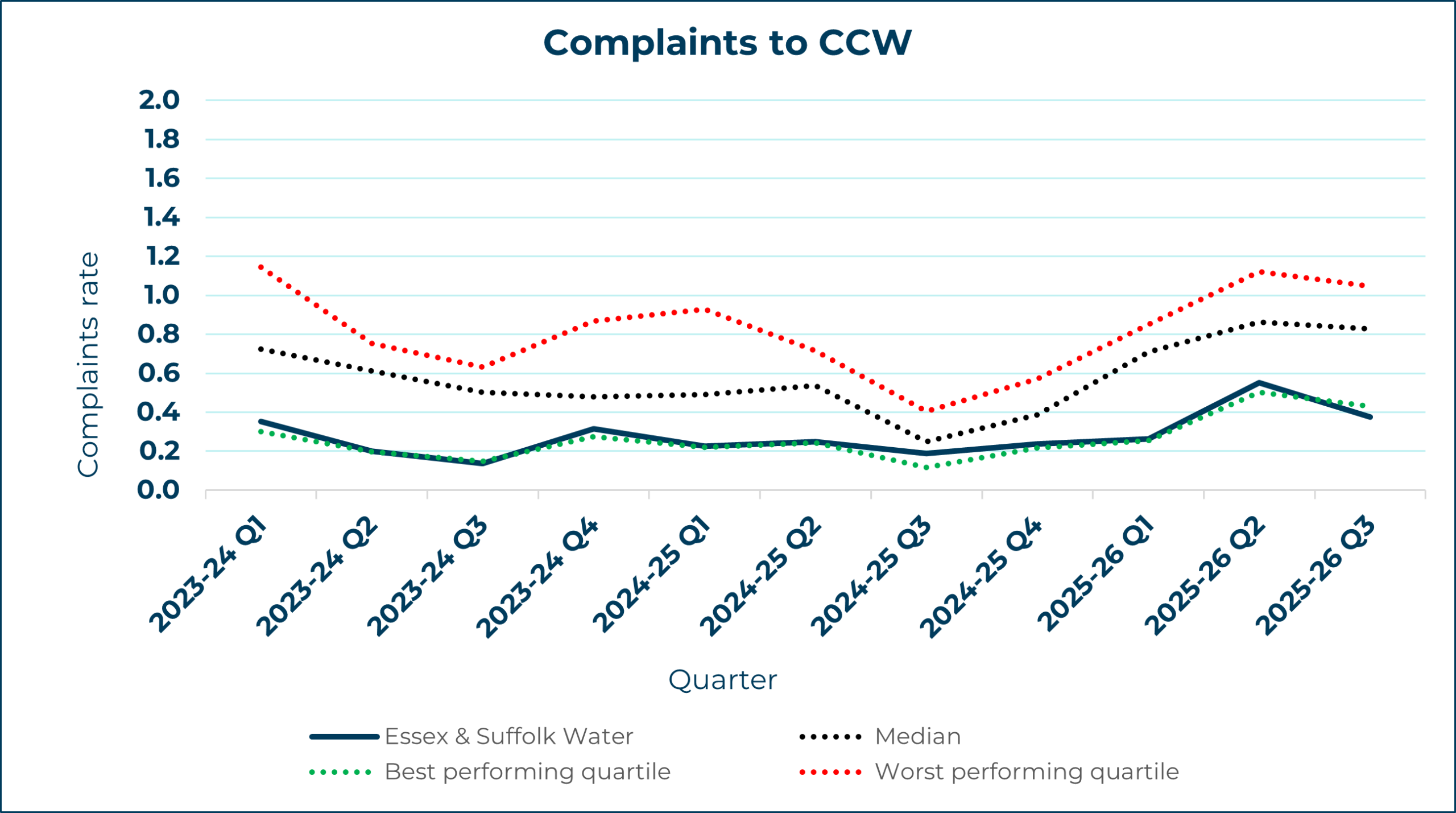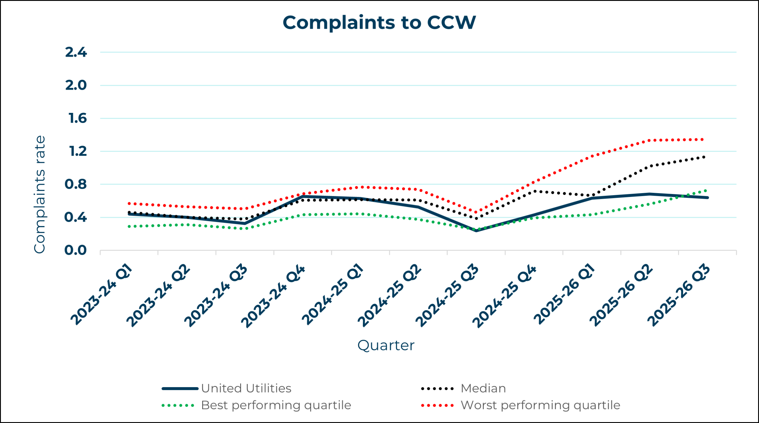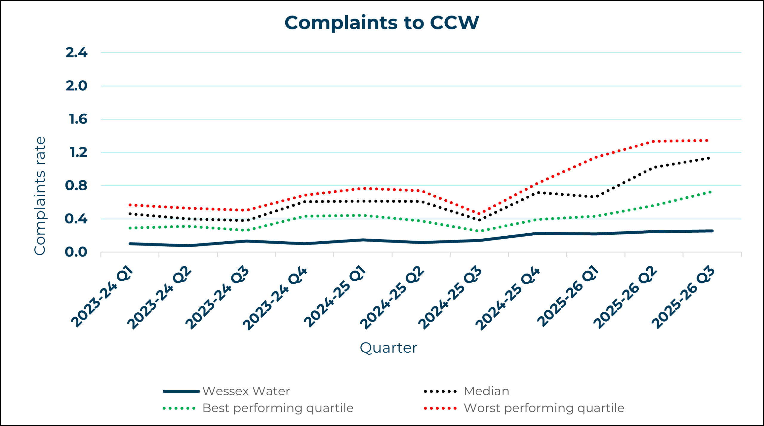 To compare companies of different sizes, we use a metric called ‘complaints per 10,000 connections’. This metric takes into account the number of water and wastewater connections each company serves.