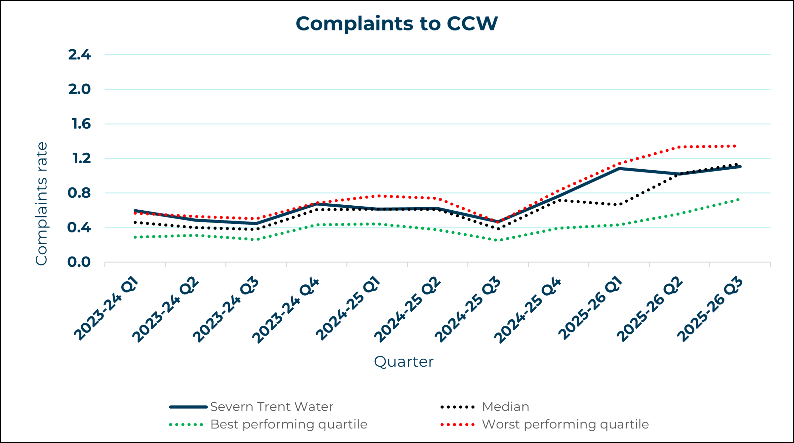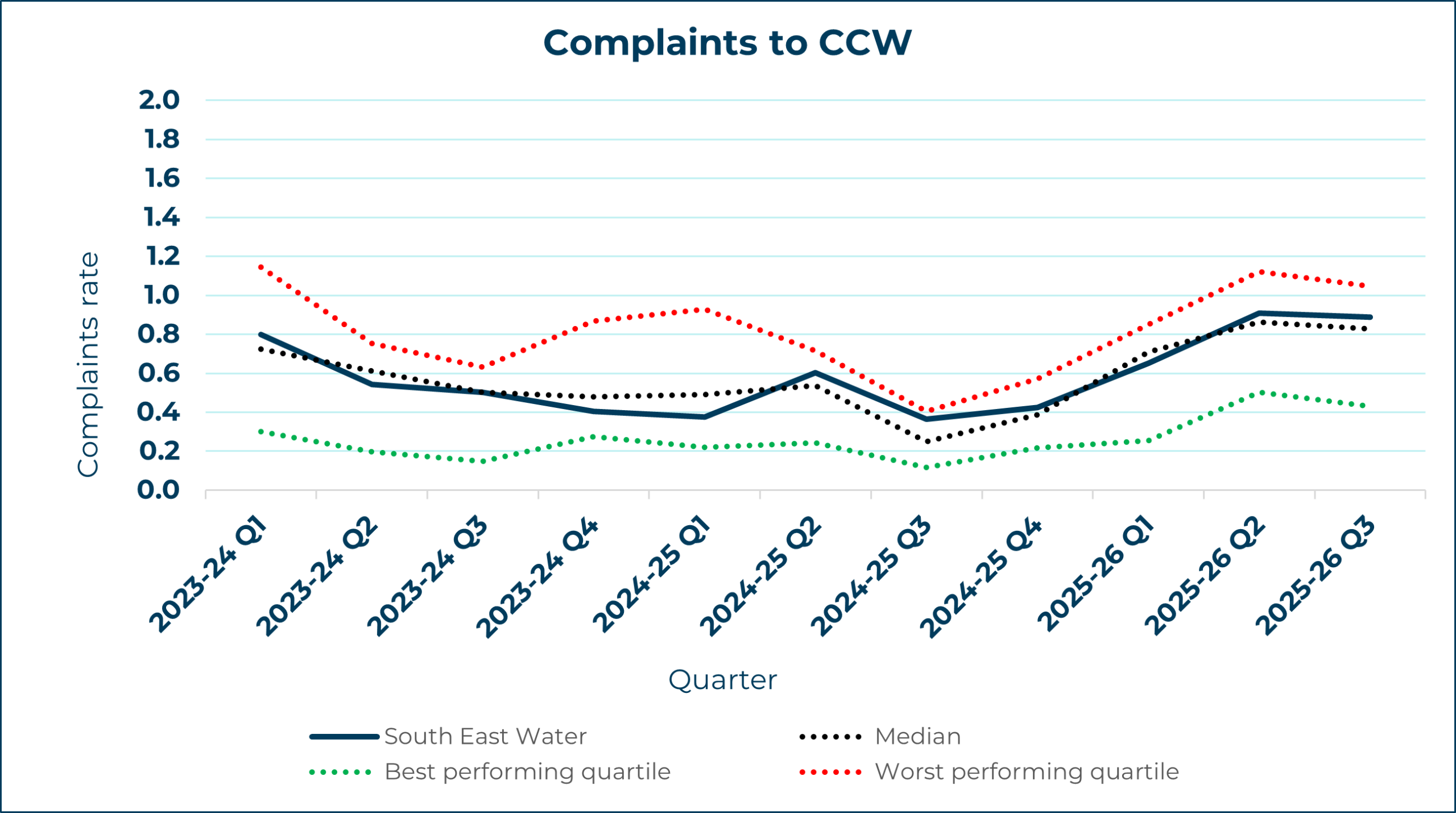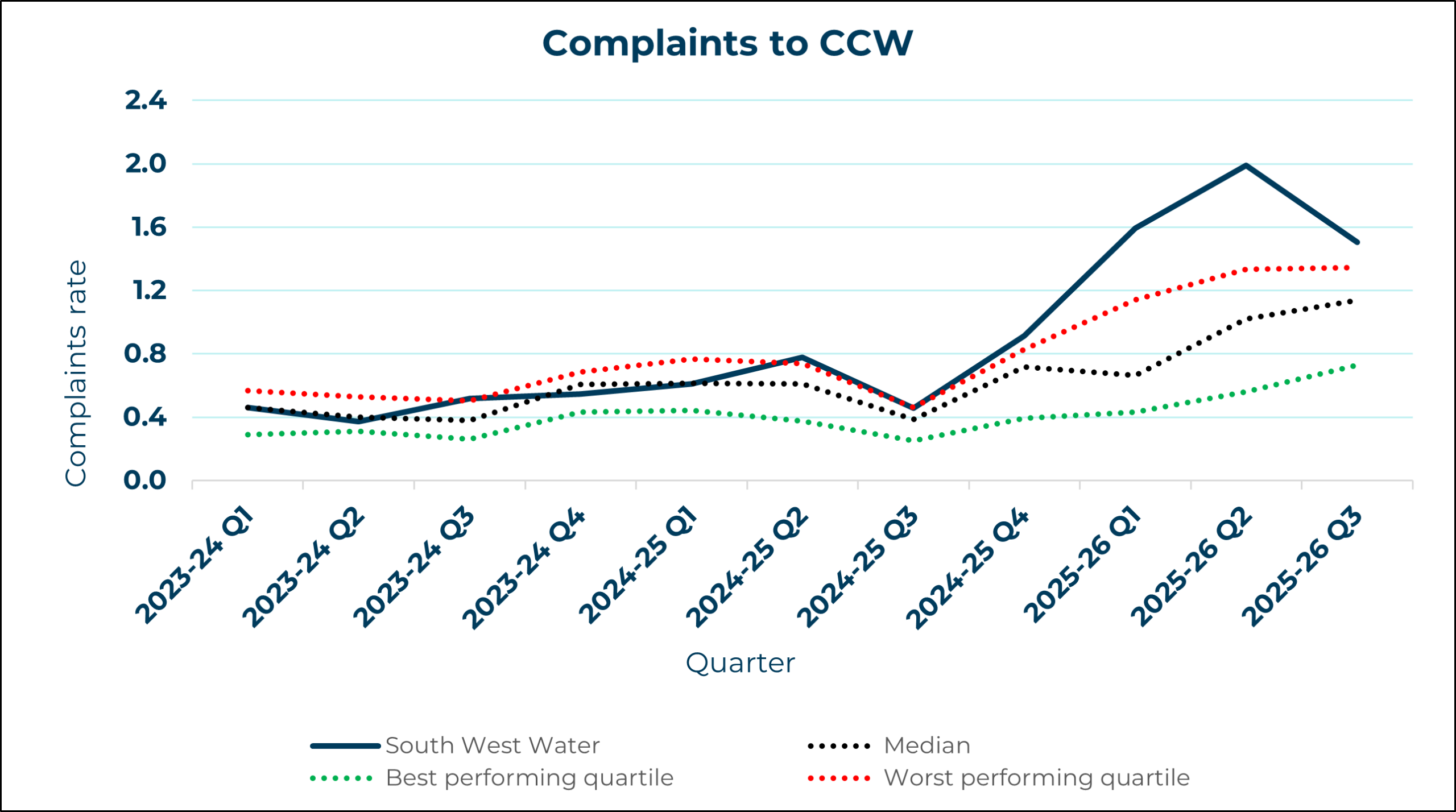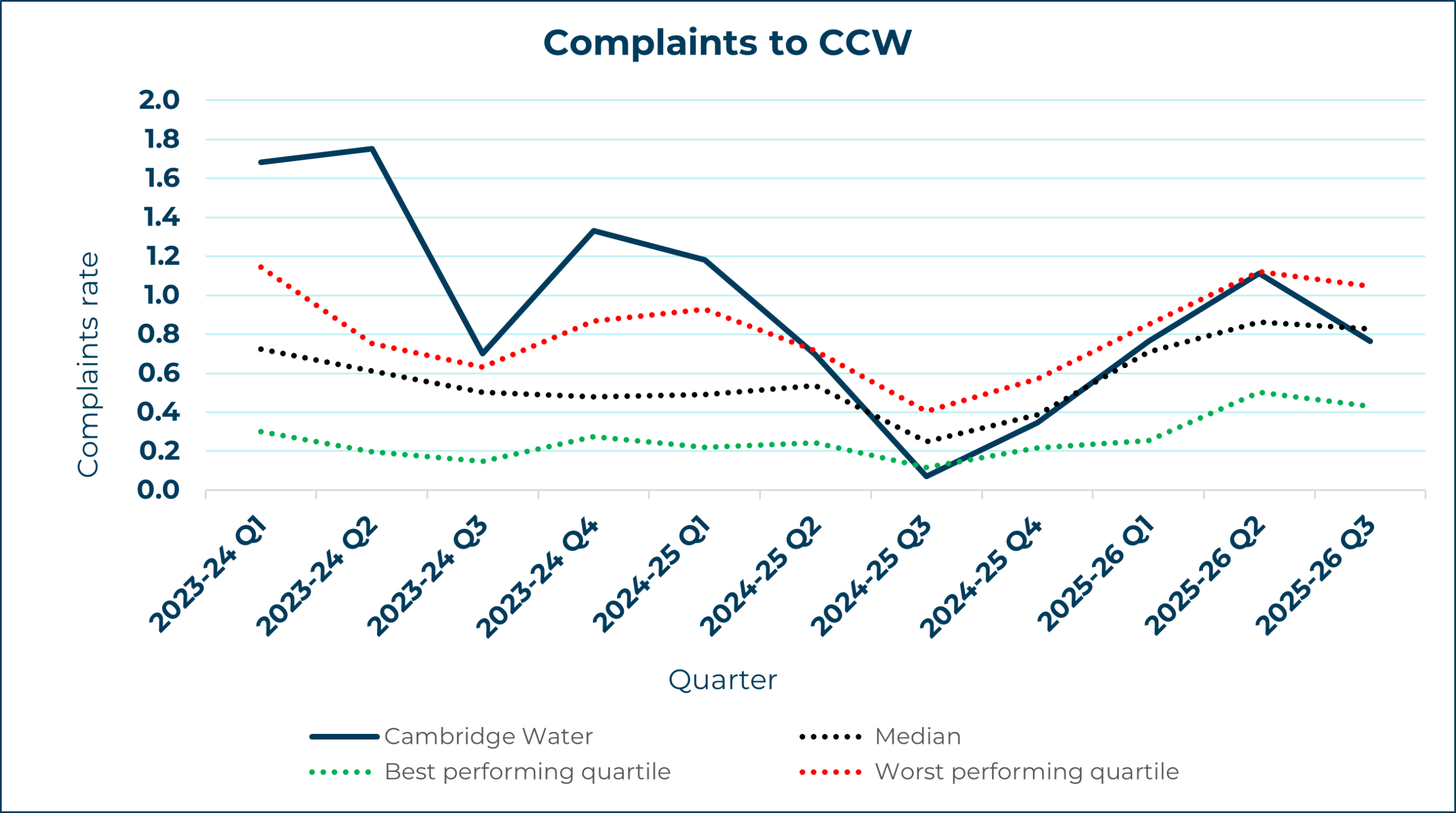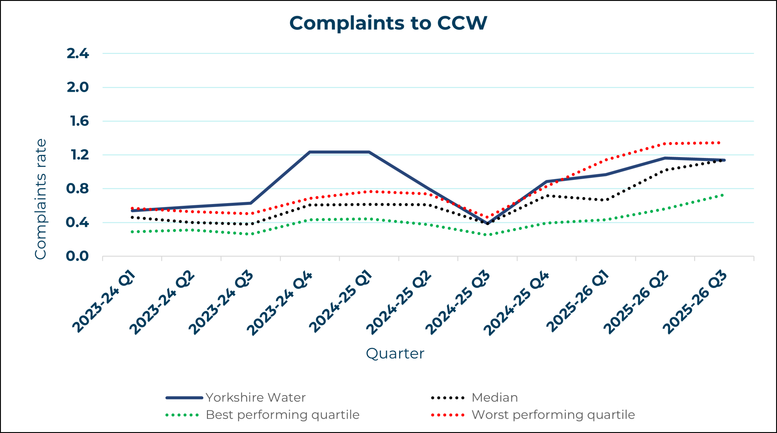 To compare companies of different sizes, we use a metric called ‘complaints per 10,000 connections’. This metric takes into account the number of water and wastewater connections each company serves.