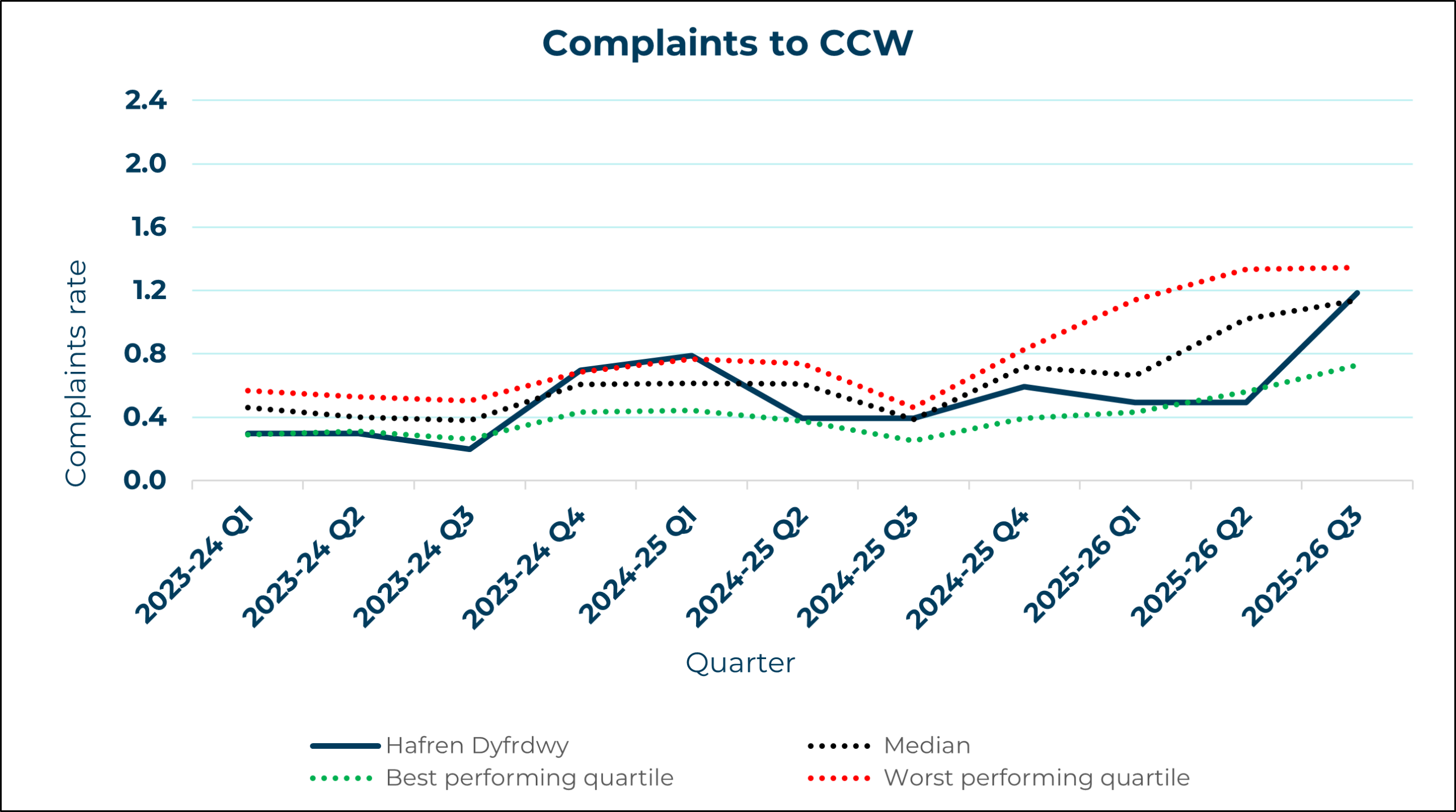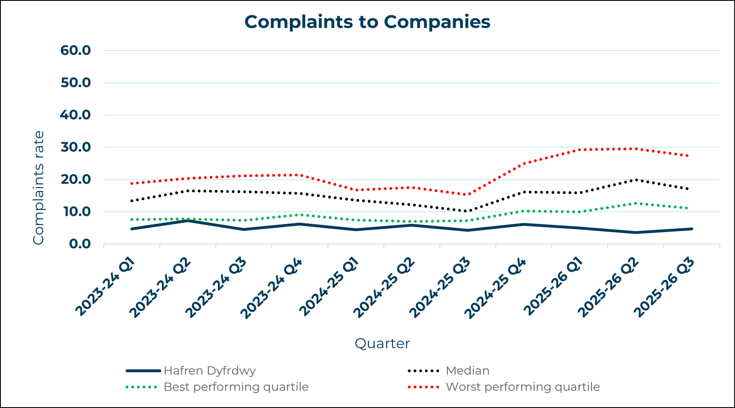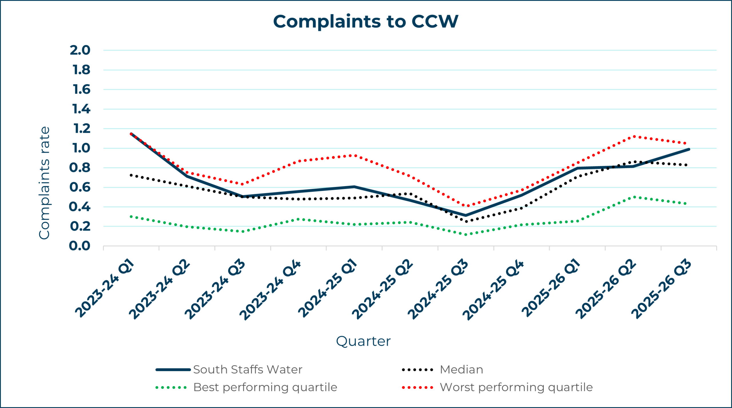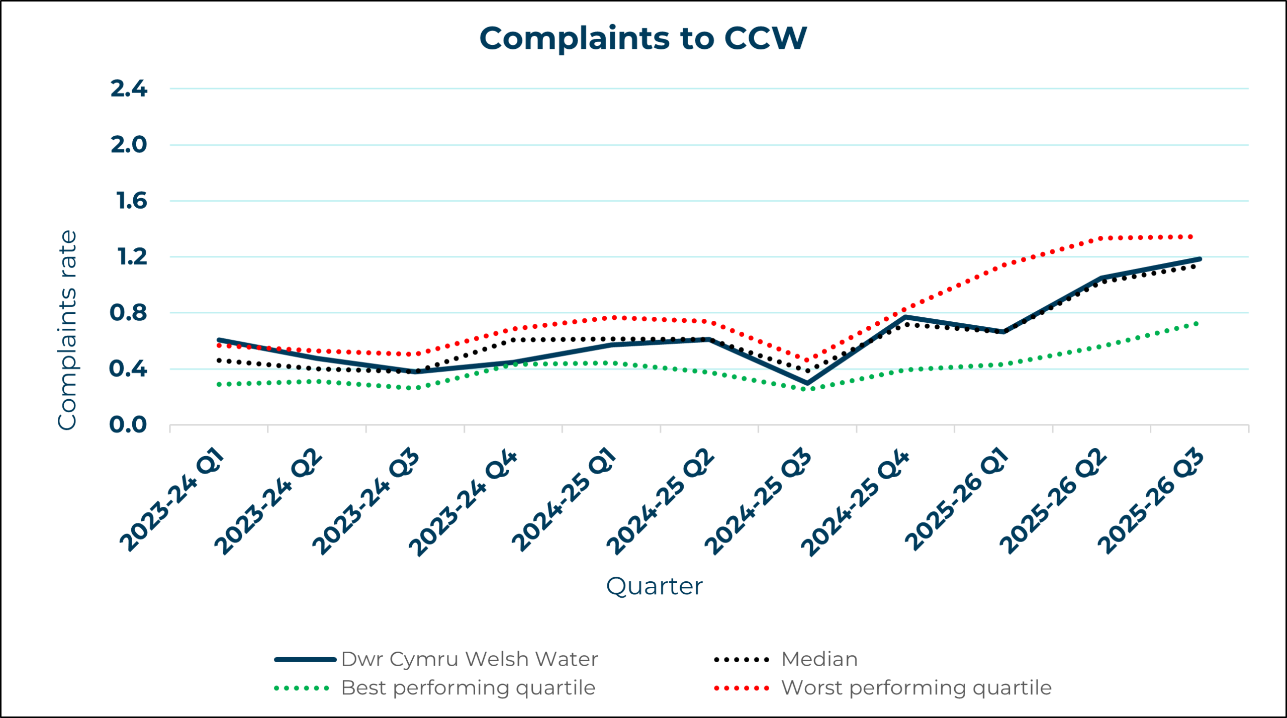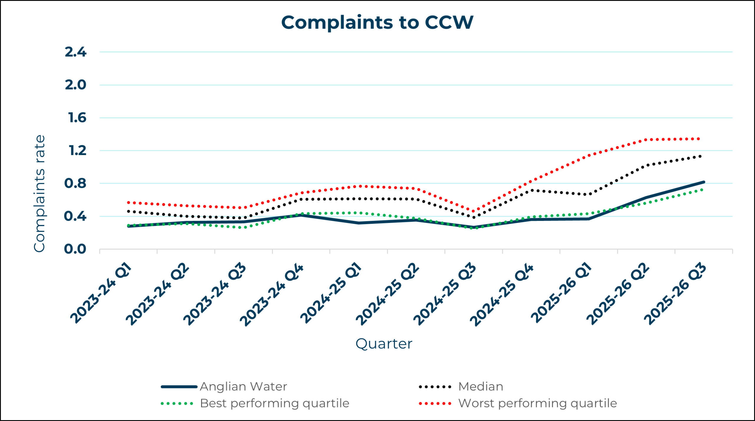 To compare companies of different sizes, we use a metric called ‘complaints per 10,000 connections’. This metric takes into account the number of water and wastewater connections each company serves.